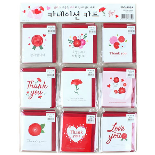 500 카네이션 카드디자인 : 9가지 디자인 / 선택불가 사이즈 : 9.5cm * 11cm * cm (가로*세로*두께 / 낱개기준, 포장상태의 크기)박스바코드 : 8809175466695개별바코드 : 880917546669514세이상 사용제품 : 사랑과 감사의 마음을 담아 카드를 전해요.좌우로 펼쳐지는 카드와 봉투 1매씩 들어있습니다.